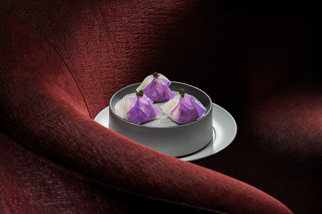 點心精選手拆蟹肉與鮮嫩蝦仁,佐以清脆蘆筍粒和天然蝶豆花汁,交織出豐富多元的口感層次,在味覺與視覺上均呈現出精緻的藝術美感。